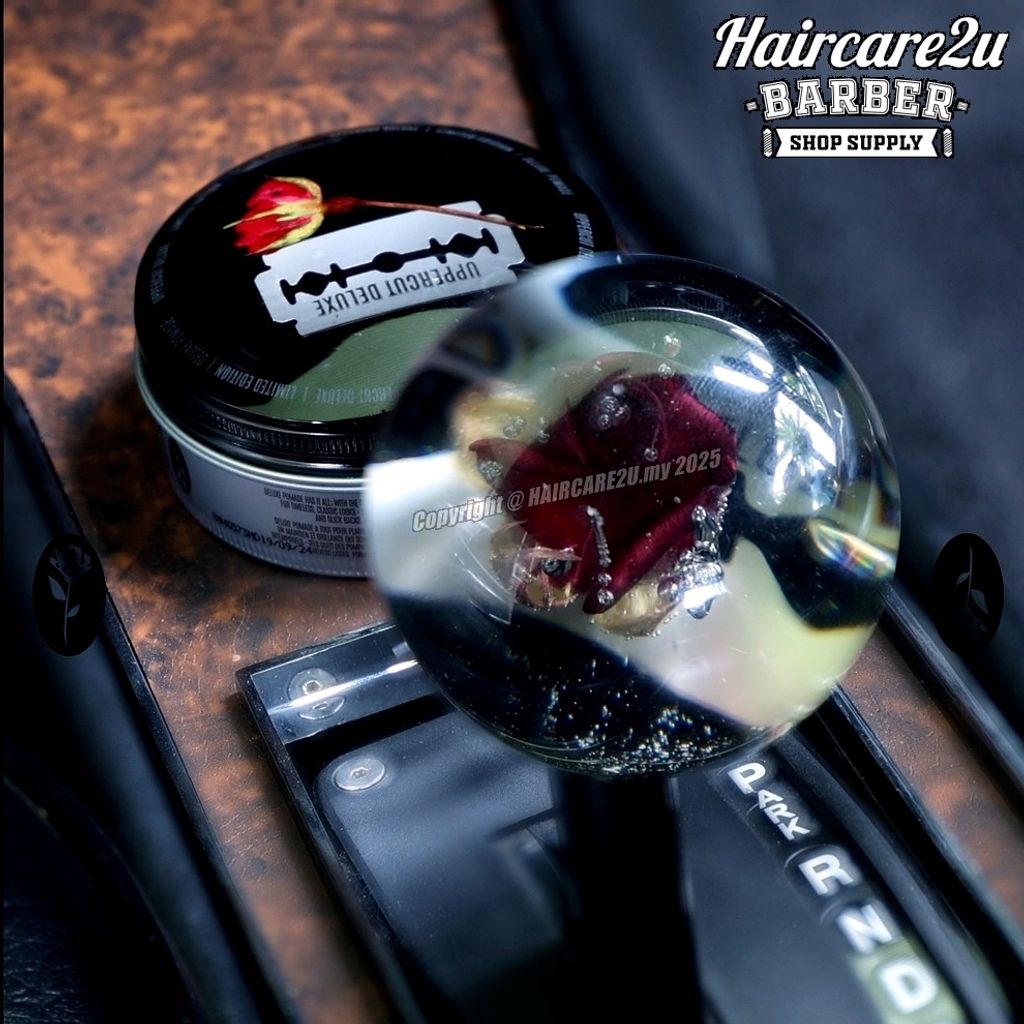 A balance of contrasts. Razor sharp and delicate. Uppercut Deluxe presents; Resin & Rose Deluxe Pomade. Clear pomade, featuring an exclusive rose fragrance - without a hint of your grandma's dresser. Topped with a handpicked, unique rose and custom machined razor blade suspended in resin; a true testament of timeless style. Each piece individual, no two are the same.