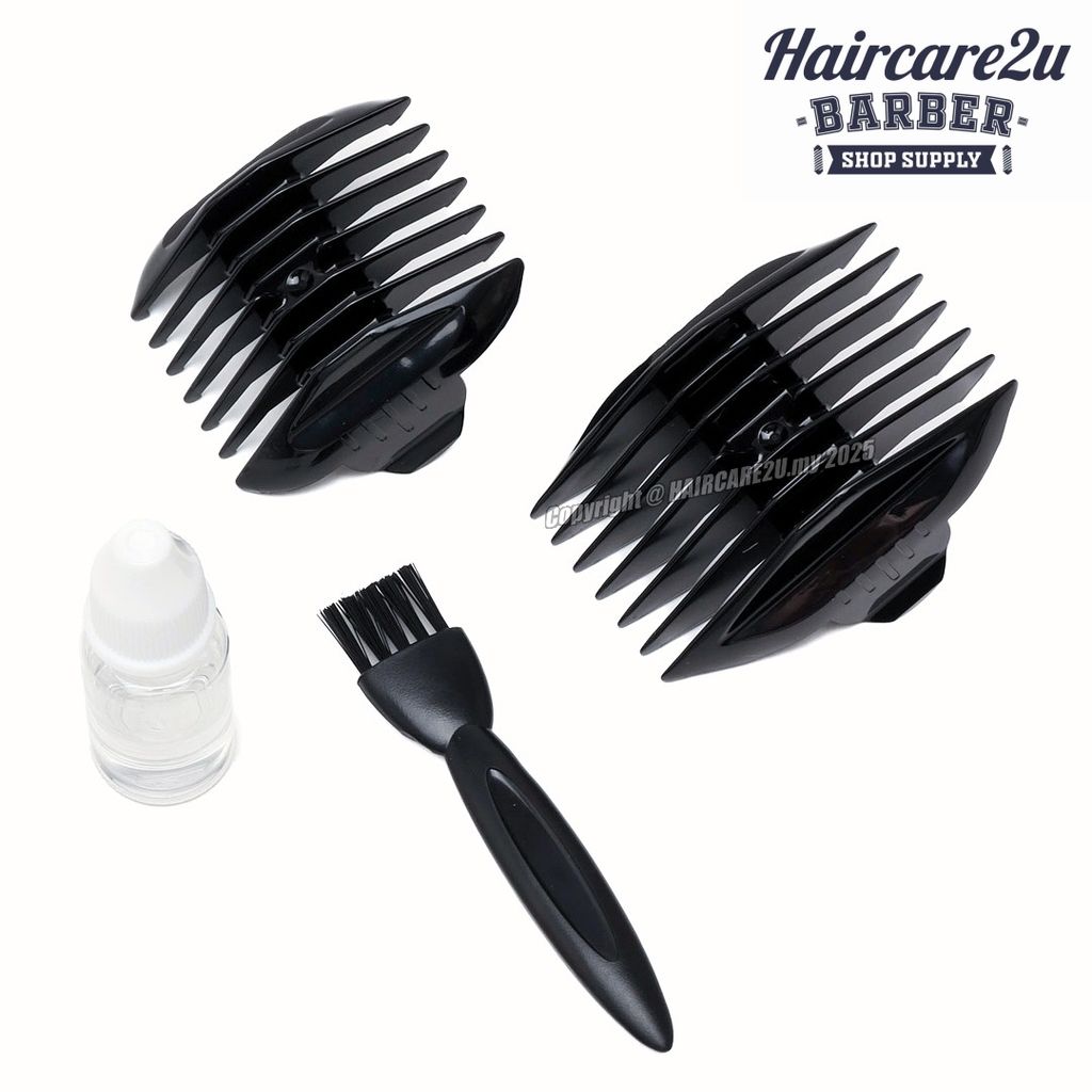 Attachments: 3/6mm,9/12mm comb guides, adapter, oil bottle, cleaning brush